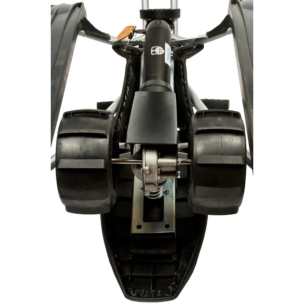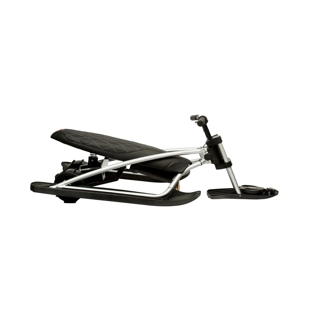 Визуального модный электроснегокат выглядит компактно и эргономично. Общий вес техники сравнительно легкий, составляет 12,7 кг. Конструкция рамы – долговечная и надежная, стальная, не деформируется при эксплуатации в жестких условиях. Большое удобное сиденье покрыто экокожей. Мягкое, повторяет анатомические части тела ездока. Лыжи изготовлены из ударопрочного пластика, гарантируют отличный накат.