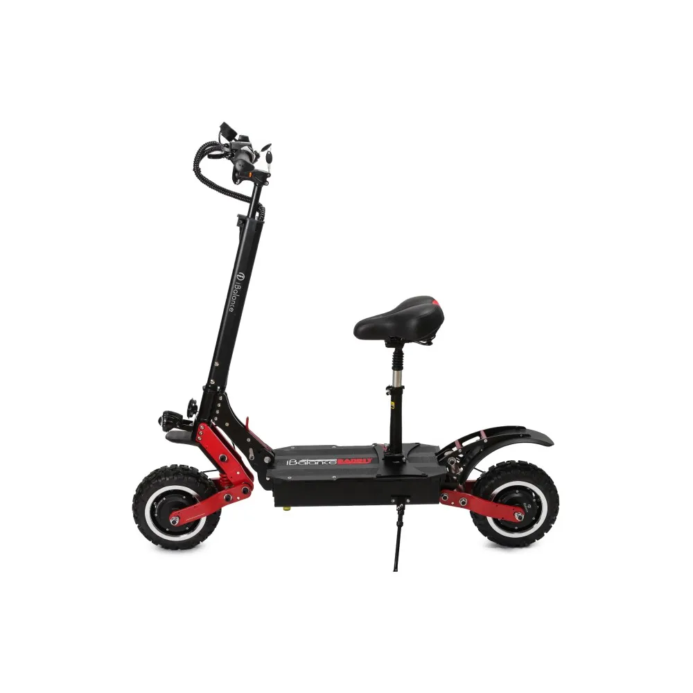 Электросамокат iBalance Bandit мощный полноприводный агрегат, который подойдет для передвижения по любому бездорожью. Прочная массивная конструкция вызывает доверие, максимальная нагрузка на устройство 150 кг. С усиленной амортизацией передних и задних колес электросамокат имеет плавный ход даже по гравийной дороге. Колеса диаметром 11 дюймов, с протекторными внедорожными шинами. В комплекте идут запасные шоссейные шины.