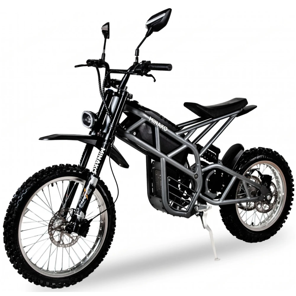 Электроскутер Minako CROSS в черном цвете визуально напоминает крутую технику, современный мопед. Привлекает внимание большая светодиодная фара и мощная рама. Дизайн подчеркивает лучшие технические характеристики. Купить электровелосипед на выгодных условиях, остаться довольными приобретением предлагает наш интернет-магазин. Техника оснащена мощным мотором на 3000 Вт, способными выжимать скорость до 100 км/час. Наличие педалей допускает езду в смешанном режиме. Емкости батареи (20000МАч) достаточно на преодоление дистанции до 100 км. Батарея размещена на раме, в защитном боксе, исключающим повреждение АКБ. С такими параметрами потребуется покупка защитных аксессуаров для ездоков. Колеса с агрессивным протектором обещают отличный накат и сцепляемость с разными видами покрытия. Допускает езду по ровной и пересеченной местности. Небольшое анатомическое седло, удобная рулевая часть с максимальным функционалом увеличивают уверенность райдера в собственных действиях. Информационный дисплей показывает важные для ездока параметры, исключает непредвиденные ситуации в виде разрядк