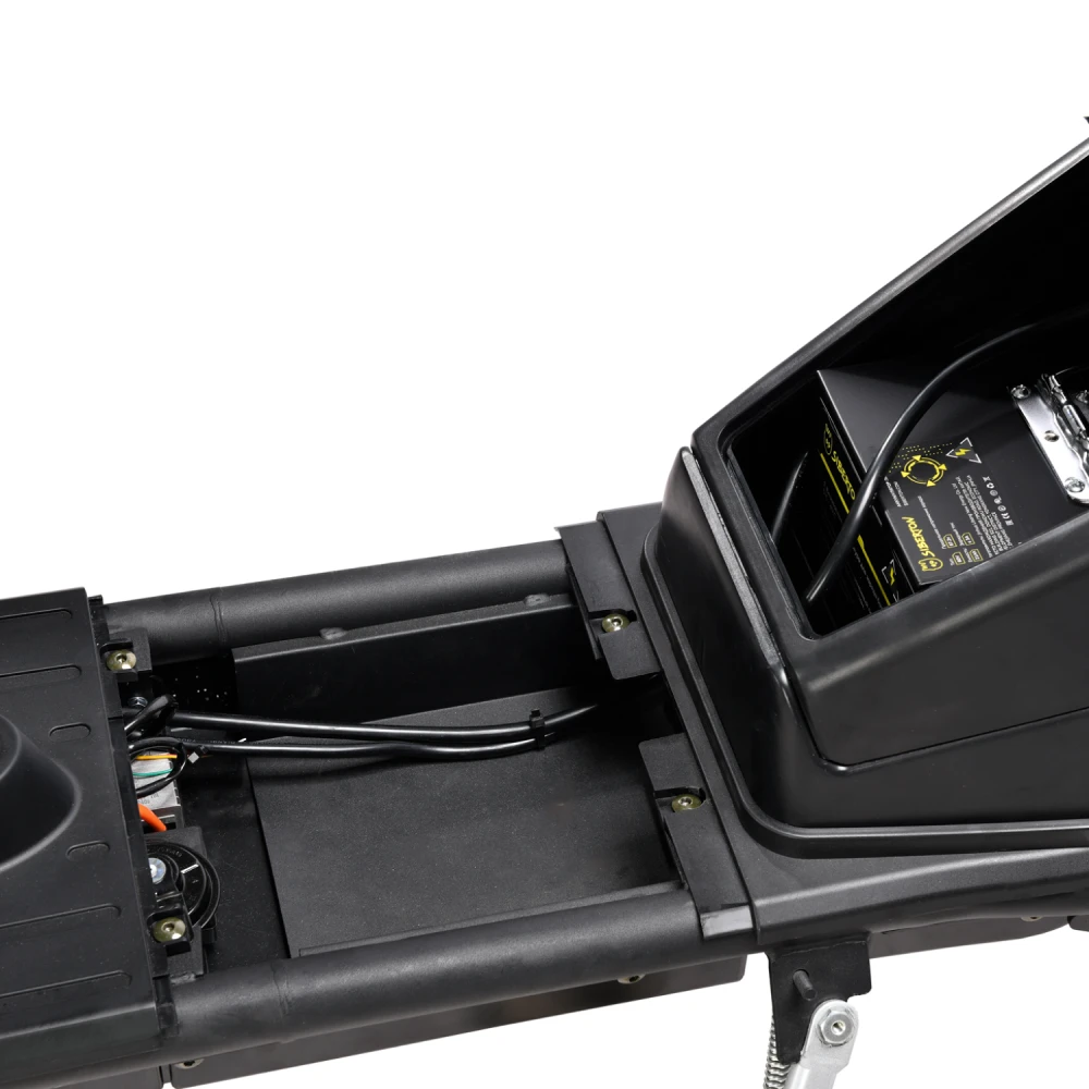 Мощность мотора 2000 Вт (номинал) обеспечивает разгон до 45 км/ч и подъемов до 20–25° даже при полной нагрузке 260 кг, но на неровностях или в дождь скорость падает. Аккумулятор Li-ion 60V дает заявленный пробег 60 км в идеале (Eco-режим, ровный асфальт), балансируют скорость/запас хода, снижая потребление на 20–30% в Eco. Тормоза — гидравлические дисковые (диаметр 120–140 мм), эффективны на мокром асфальте; энергоэффективность высока благодаря рекуперации (5–10% возврата энергии); зарядка (7 часов) стандартна для Li-ion без потери срока службы.
