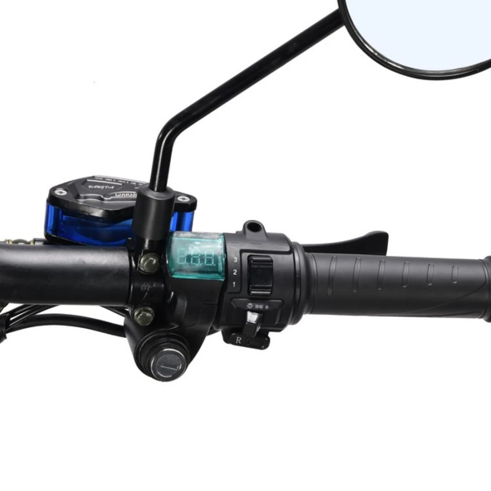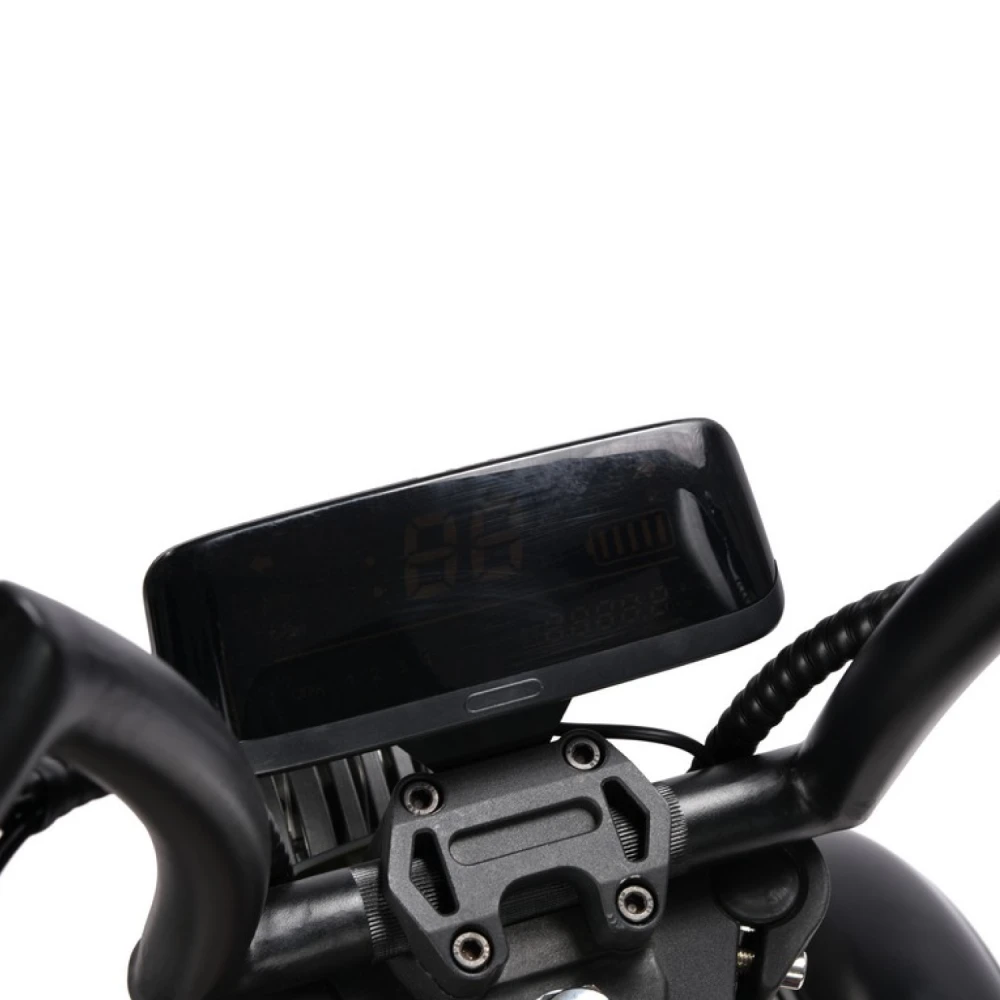 Информационная панель показывает скорость, заряд, пробег и режим. Доступны круиз-контроль, базовое освещение и опциональные трекер/сигнализация.