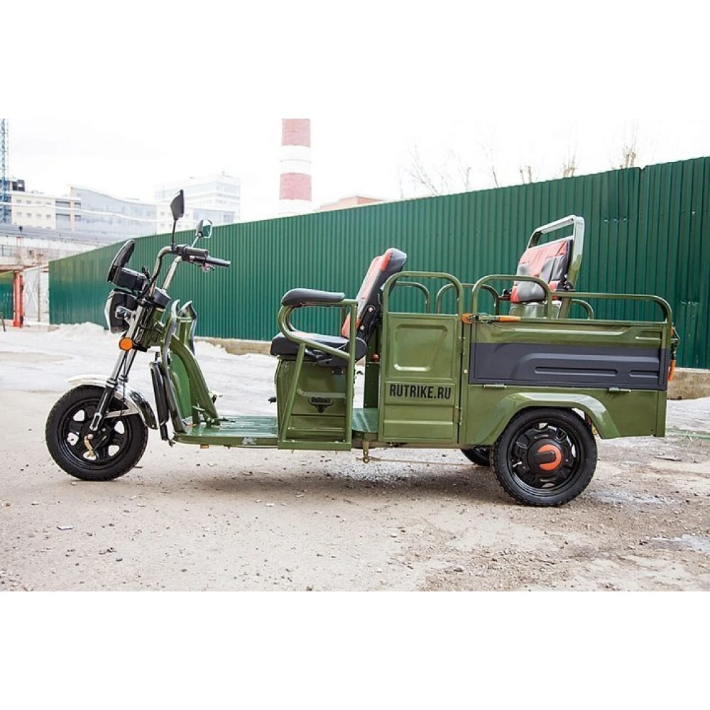 Груовой электротрицикл Rutrike Вояж-П 1200 Трансформер 60В 80 Вт в зеленом цветовом оттенке - техника, предназначенная для лиц с активной жизненной позицией, жителей сельских районов, для которых отдых на свежем воздухе находится на первом месте. Электротрицикл грузоподъемностью до 400кг идеально подходит для вылазок с друзьями, езды на рыбалку и другие мероприятия на природе.