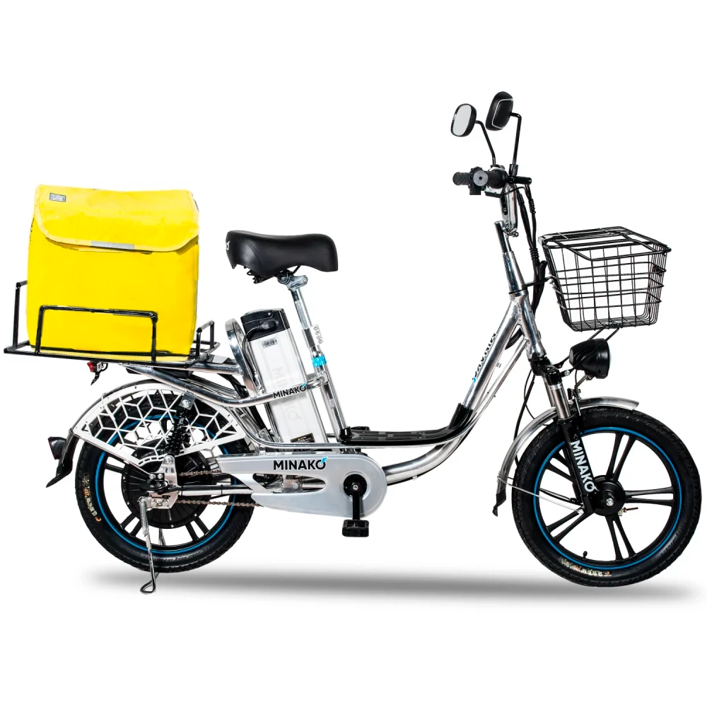 Велосипед прост в управлении и ремонте. Для удобства вождения имеется мягкое сиденье и платформа для ног. Так как изначально это модель была продумана для сферы услуг доставки, то можно установить дополнительную корзину-багажник сзади. Подойдут для перевозки каких-либо вещей или сумок. Безопасность и комфорт на дорогах обеспечат 2 зеркала заднего вида, а также надежные барабанные тормоза. Мощное мотор-колесо позволяет разогнаться до 50 км/ч. Емкий аккумулятор 60В/12Ач рассчитан на пробег до 45 км на одном заряде.