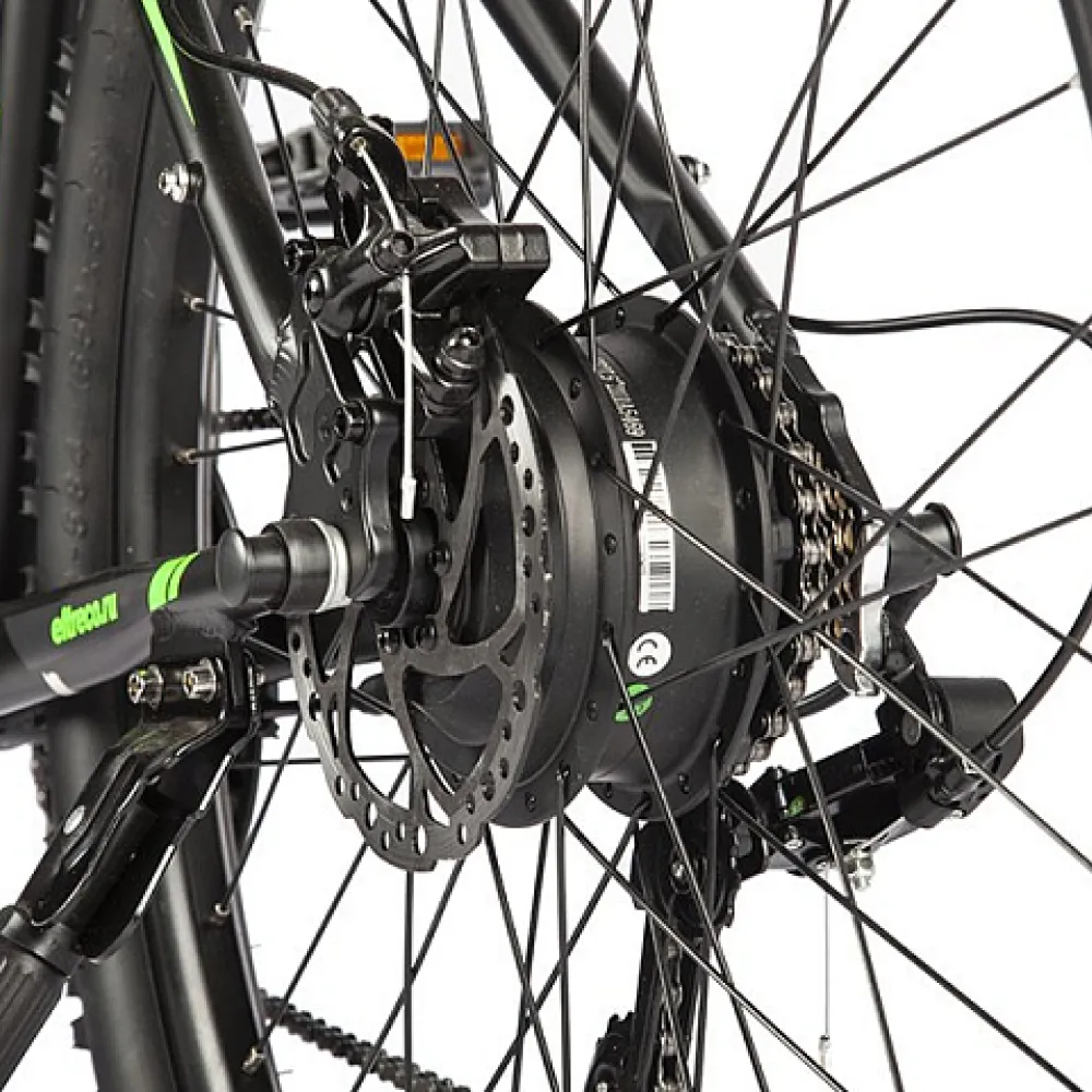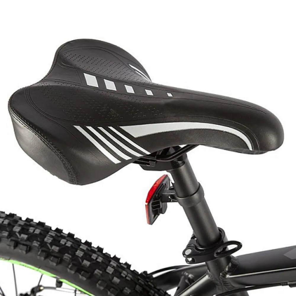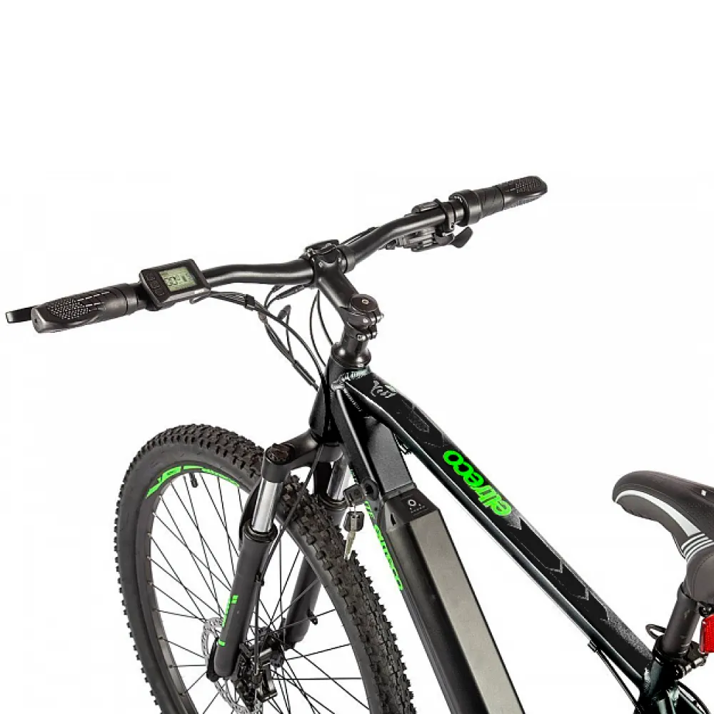 Электровелосипед Eltreco Ultra Lite в черно-зеленой расцветке включает в себя особенности, которые обеспечивают безопасность езды.