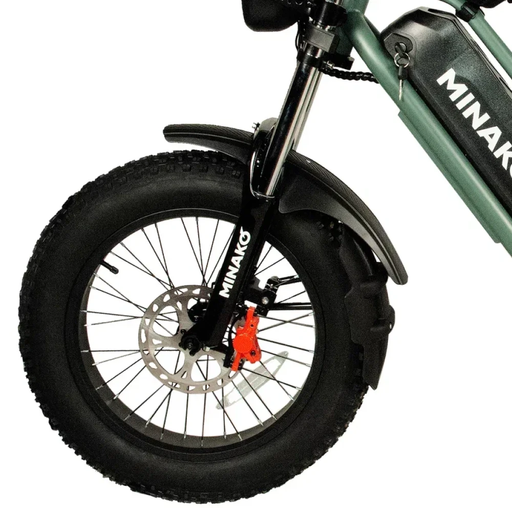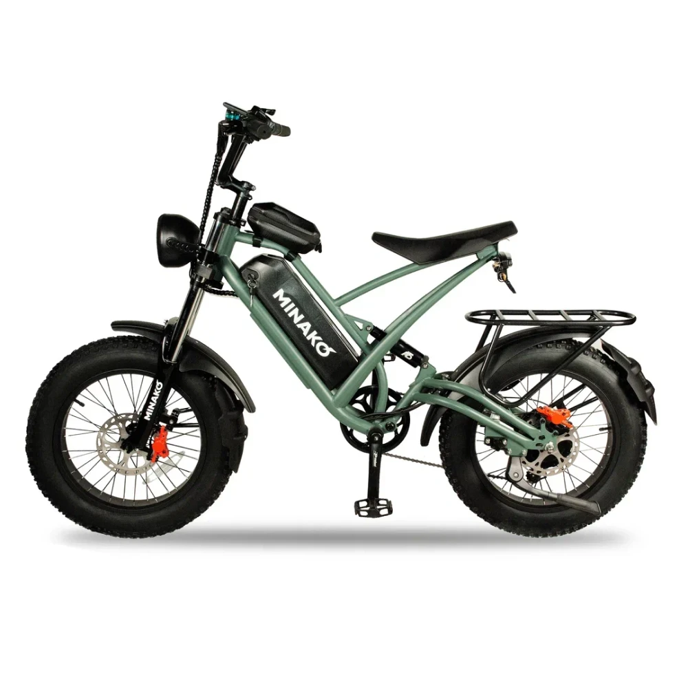 Электровелосипед Minako FOX (23Ah) в оливковом цвете - это сочетание мощности, стиля и удобства. С его 1000W двигателем, вы можете достичь максимальной скорости 55 км/ч, а 23 Ah аккумулятор обеспечивает пробег до 60 км на одном заряде. Уникальный дизайн, напоминающий питбайк, и мотоциклетная вилка подчеркивают его агрессивный вид. Большие внедорожные покрышки и гидравлические дисковые тормоза обеспечивают безопасность и уверенность на дороге. Багажник сзади, который можно использовать как место для пассажира, небольшая сумка спереди и стоп-сигнал делают его еще более удобным. Помимо переднего мотоциклетного амортизатора, есть еще и задний велосипедный амортизатор закрытого типа, обеспечивающий комфортную езду.