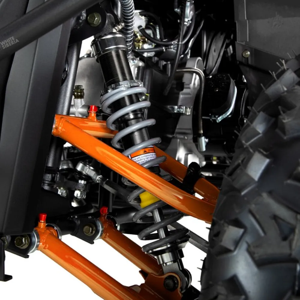 WHITE SIBERIA BARS 200CC PRO оснащен 200-кубовым четырехтактным двигателем мощностью 12 500 Вт (около 17 л.с.) с балансировочным валом, обеспечивающим плавность работы и надежность. Трансмиссия вариаторного типа с передним, нейтральным и задним ходом (F-N-R) упрощает управление и позволяет комфортно передвигаться в самых разных условиях. Модель отличается двухподвесной системой: передняя — 2-х рычажная шаровая, задняя — гидравлический амортизатор с регулировкой жесткости, что обеспечивает плавный ход и устойчивость даже на неровностях. Каркас из стали повышает прочность и долговечность квадроцикла. Среди уникальных решений — подогрев ручек для комфорта в холодное время года и наличие лебедки для самовывоза из трудных мест. Модель получила положительные отзывы за сочетание мощности и плавности хода в своем классе.