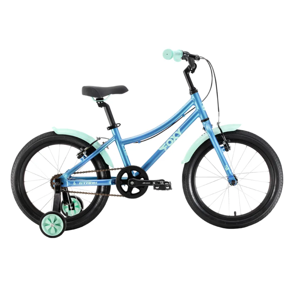 Велосипед Stark'22 Foxy Girl 18 синий/мятный также оснащен двумя детскими колесиками, которые обеспечивают стабильность и помогают начинающим велосипедисткам освоить навыки езды.